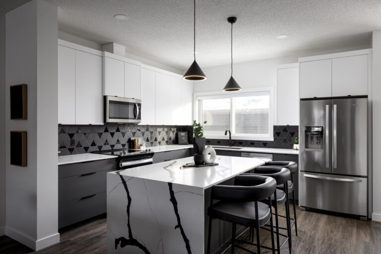 • ¾” Granite or Quartz countertops in a variety of colour choices with double undermount stainless steel sink; single chrome handle pullout faucet and full height 4” x 12” subway tile backsplash