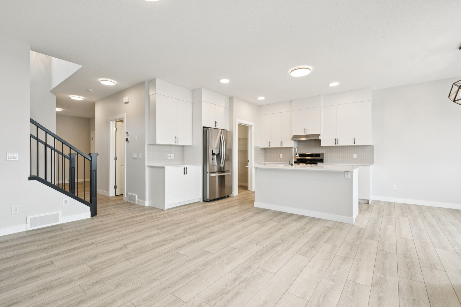 • The open-concept main floor features a large kitchen island, walk-in pantry, dining nook, and bright living room with an electric fireplace.