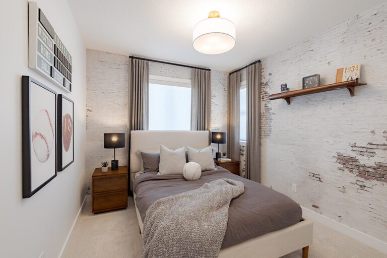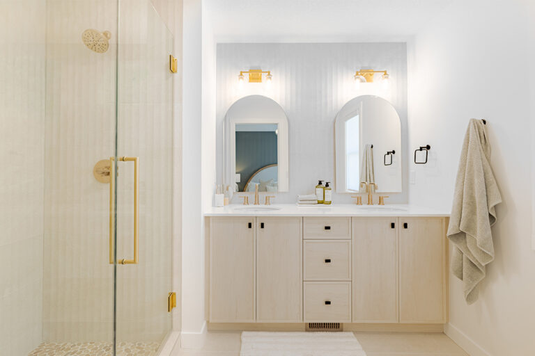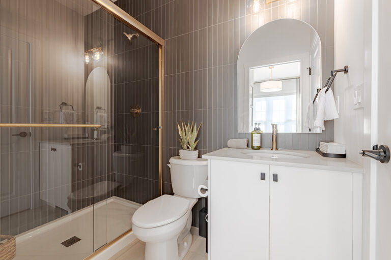 • Separate fiberglass shower stall in ensuite (as per plan) with 4” x 12” subway tile to ceiling