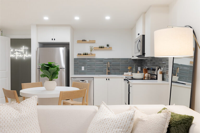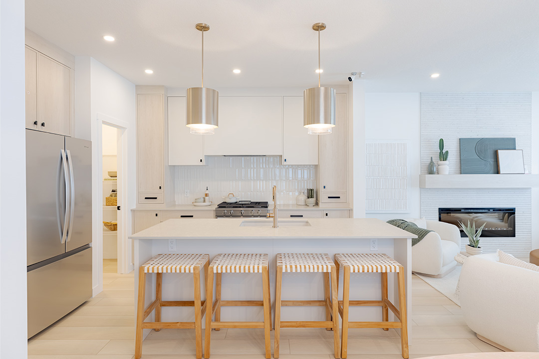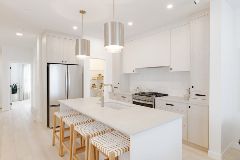 • ¾” Granite or Quartz countertops in a variety of colour choices with double undermount stainless steel sink; single chrome handle pull-down faucet and full height 4” x 12” subway tile backsplash or equivalent